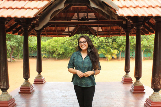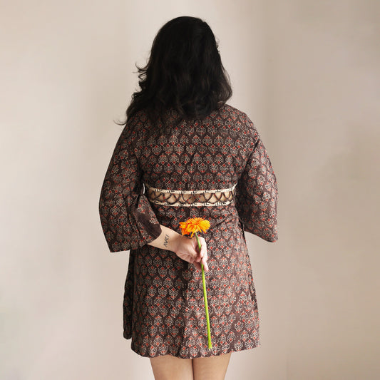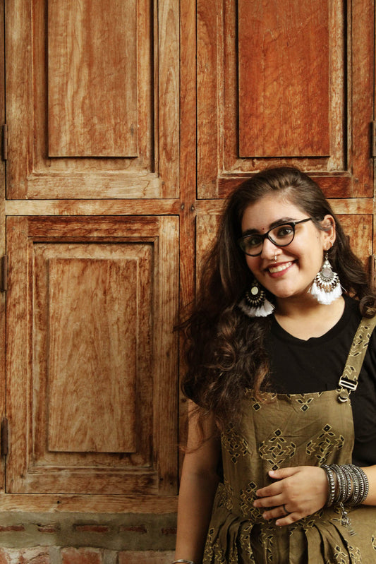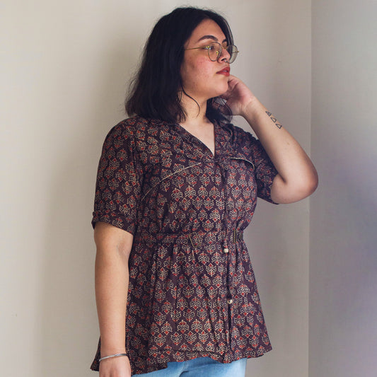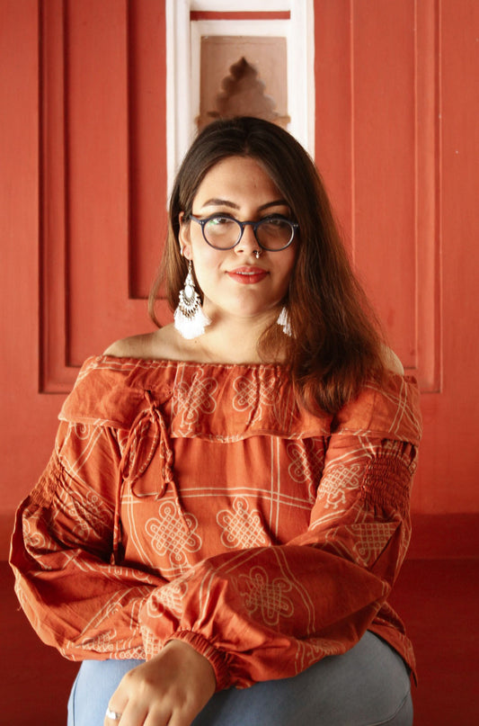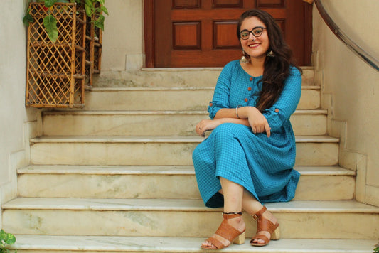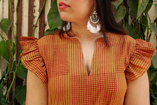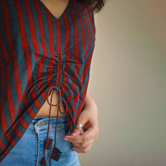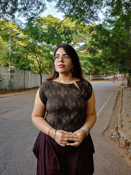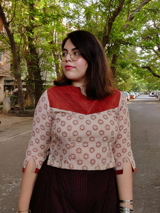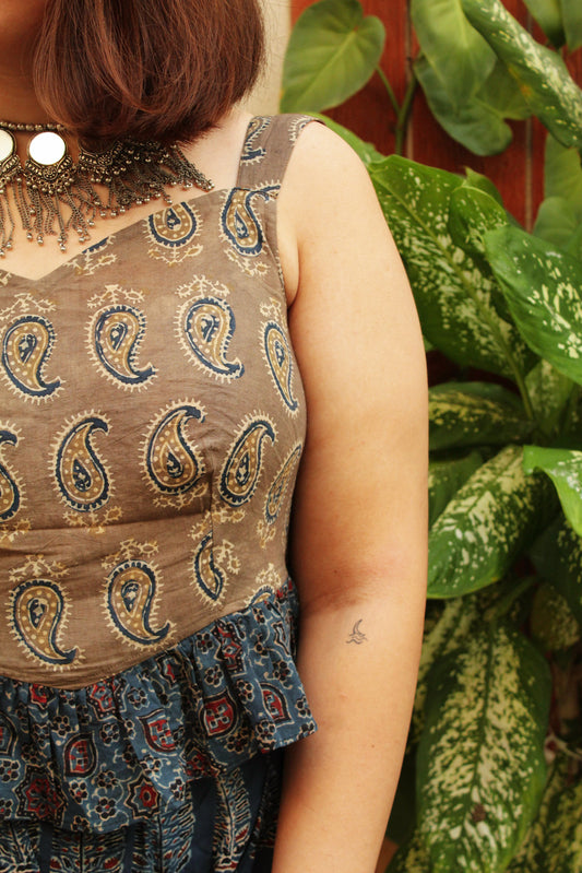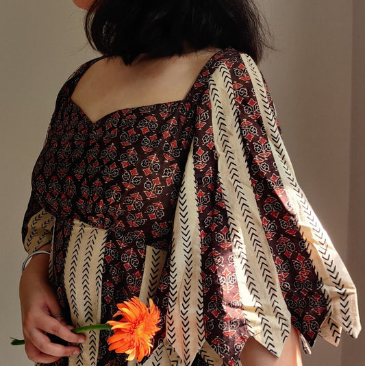 Chakra is what we're enjoying wearing this summer. A criss-cross bodice, soft mul cotton teamed with a naturally dyed organic cotton to form beautiful box pleats adding a contrast; breathable & unconventional. The pieces from this collection are constructed using hand-crafted Ajrakh fabric made from natural dyes, organic cotton & hand-blocked prints, and pure Mul cotton.