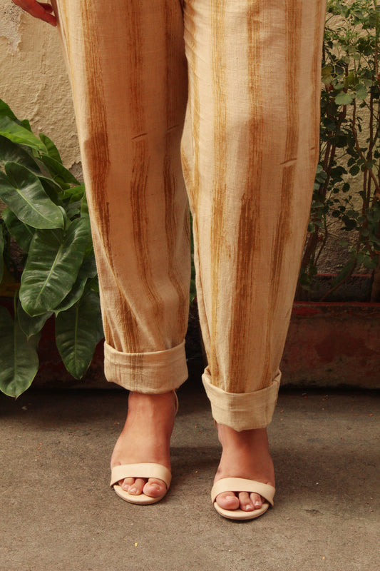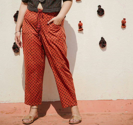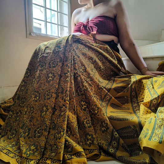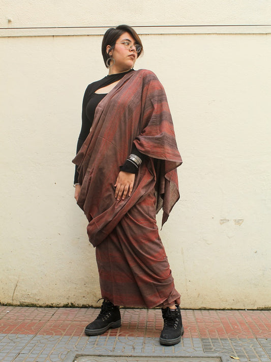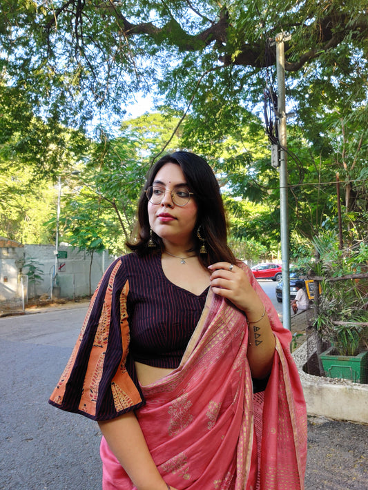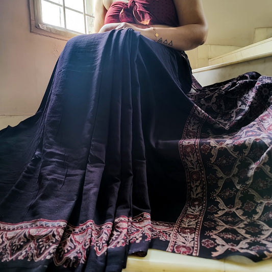These sarees are what come to our mind when we hear the phrase 'Light as a feather'. Soft on skin, easy to carry, which also makes it great for everyday wear. Enhanced with a combination of rust & black brush strokes on pure Mul cotton, entirely dyed with natural dyes. It has an attached blouse with the same combination as the pallu of the saree.