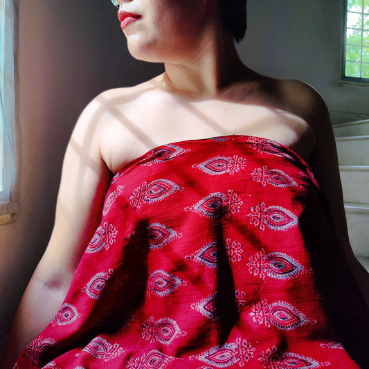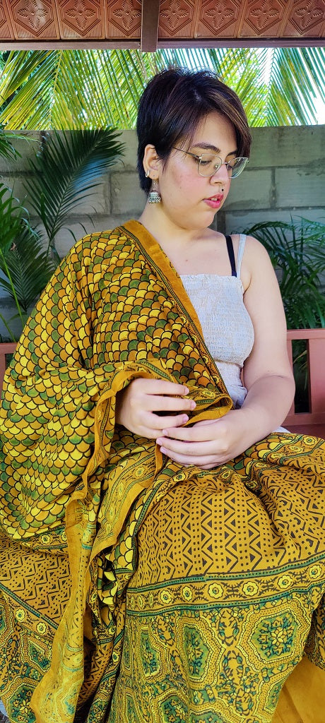 Block printed, ethically sourced, naturally dyed, soft Pashmina Cotton dupatta with a combination of peacock green, black, red and the zari elevate the look of this chunariya. Our dupattas are not aggressive on your skin. They are light and comfortable to wear.